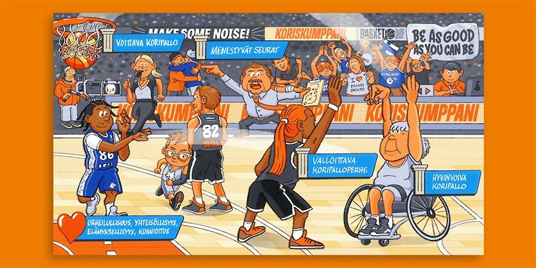 Koripalloliiton tuoreen strategian kuvittanut Antti Kyrö piilottaa muihinkin suunnittelutöihinsä korisviittauksia.